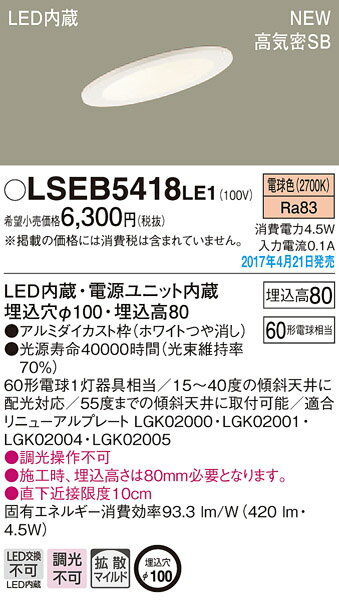 LED(電球色)浅型8HLED内蔵電源ユニット内蔵LED(電球色タイプ)1個CO(埋込穴)Φ100・D(埋込高さ)80●適合リニューアルプレート・LGK02000●適合リニューアルプレート・LGK02001●適合リニューアルプレート・LGK02004●適合リニューアルプレート・LGK02005●15〜40度の傾斜天井に配光対応●55度までの傾斜天井に取付可能●調光操作不可●施工時、埋込高さは80mm必要となります。